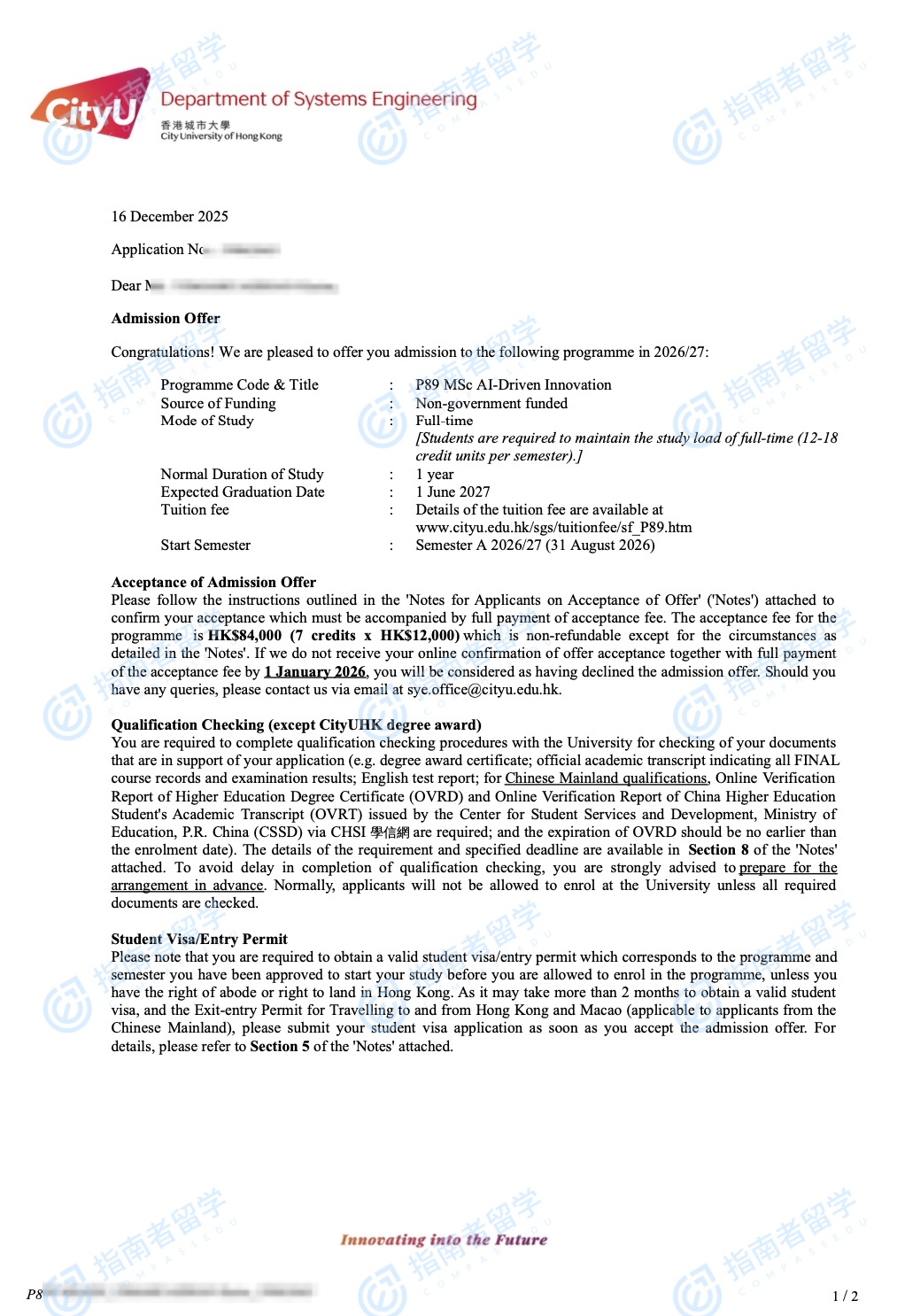 香港城市大學人工智能驅動創(chuàng)新理學碩士研究生offer一枚