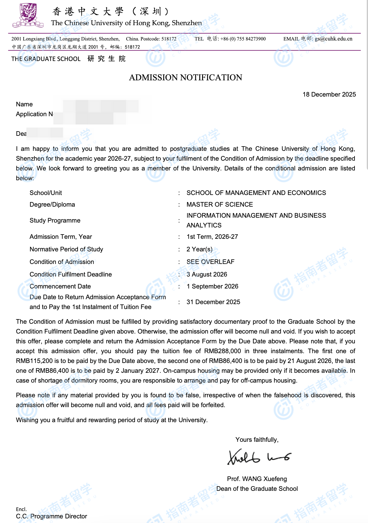 香港中文大學信息管理 & 商業(yè)分析理學碩士(CUHK-Shenzhen)研究生offer一枚