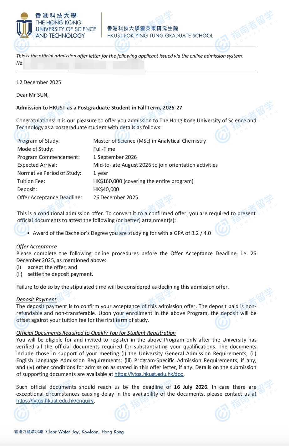 香港科技大學(xué)分析化學(xué)理學(xué)碩士研究生offer一枚