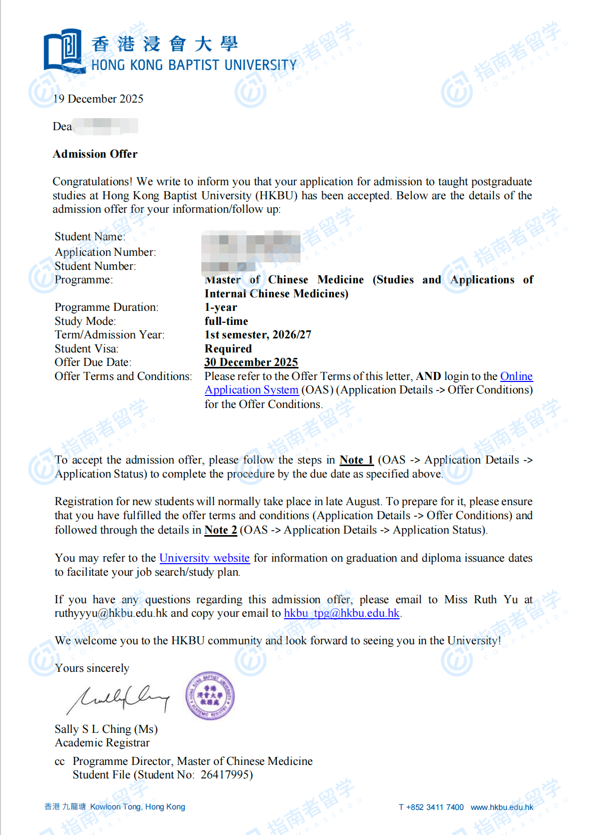 香港浸會(huì)大學(xué)中醫(yī)學(xué)碩士研究生offer一枚