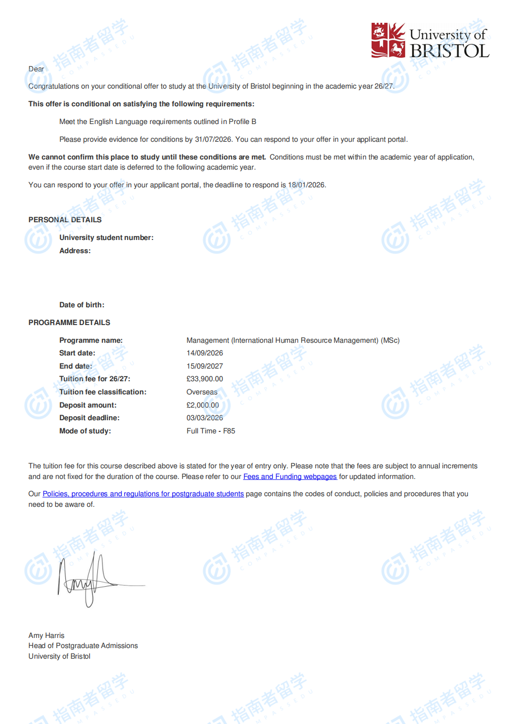 布里斯托大學(xué)管理學(xué)理學(xué)碩士(國際人力資源管理)研究生offer一枚