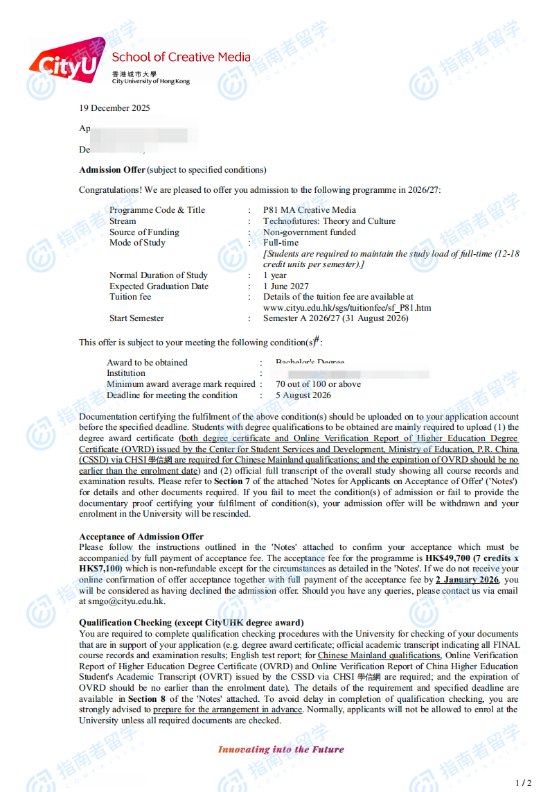 香港城市大學創(chuàng)意媒體文學碩士研究生offer一枚