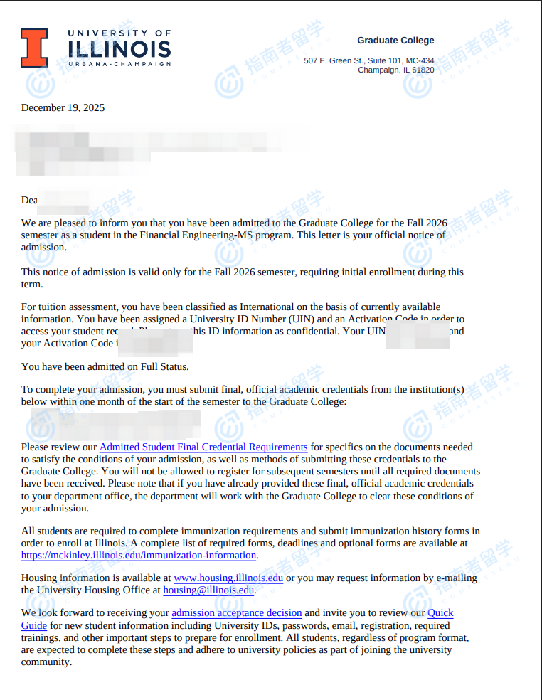 伊利諾伊大學香檳分校金融工程碩士研究生offer一枚