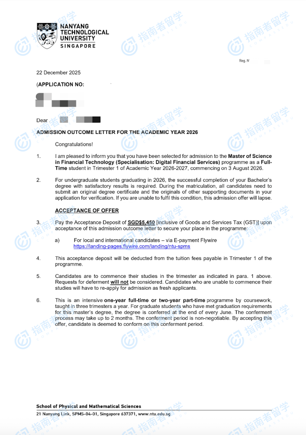 南洋理工大學(xué)金融科技理學(xué)碩士(數(shù)字金融服務(wù))研究生offer一枚