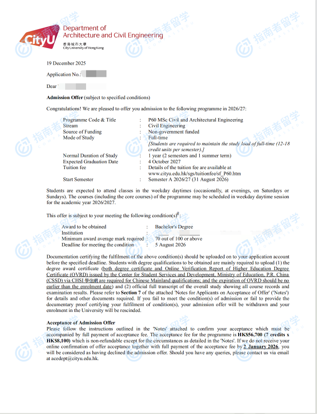 香港城市大學(xué)土木與建筑工程理學(xué)碩士研究生offer一枚
