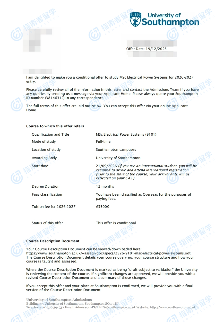 南安普頓大學電力系統(tǒng)理學碩士研究生offer一枚