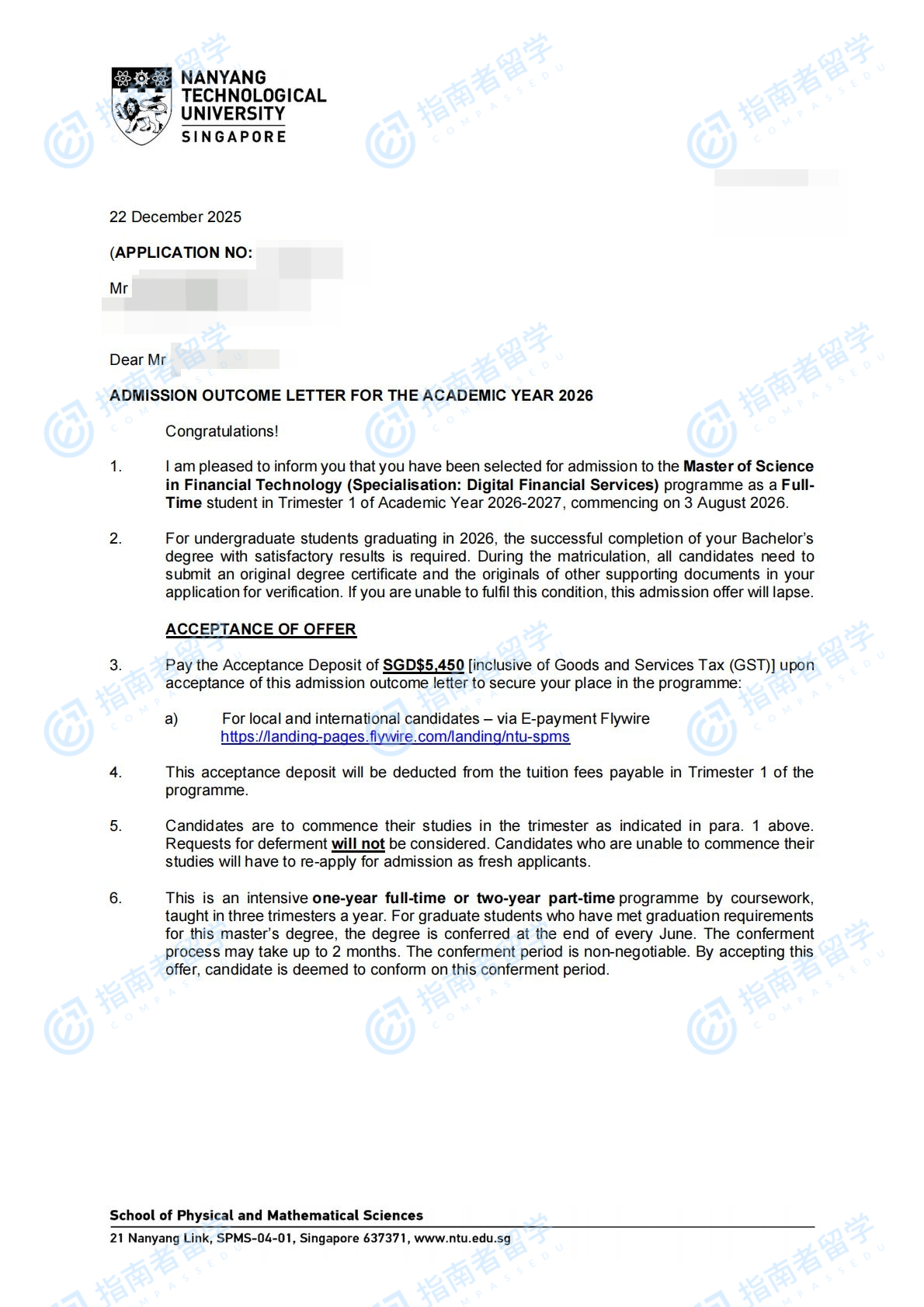 南洋理工大學(xué)金融科技理學(xué)碩士(數(shù)字金融服務(wù))研究生offer一枚