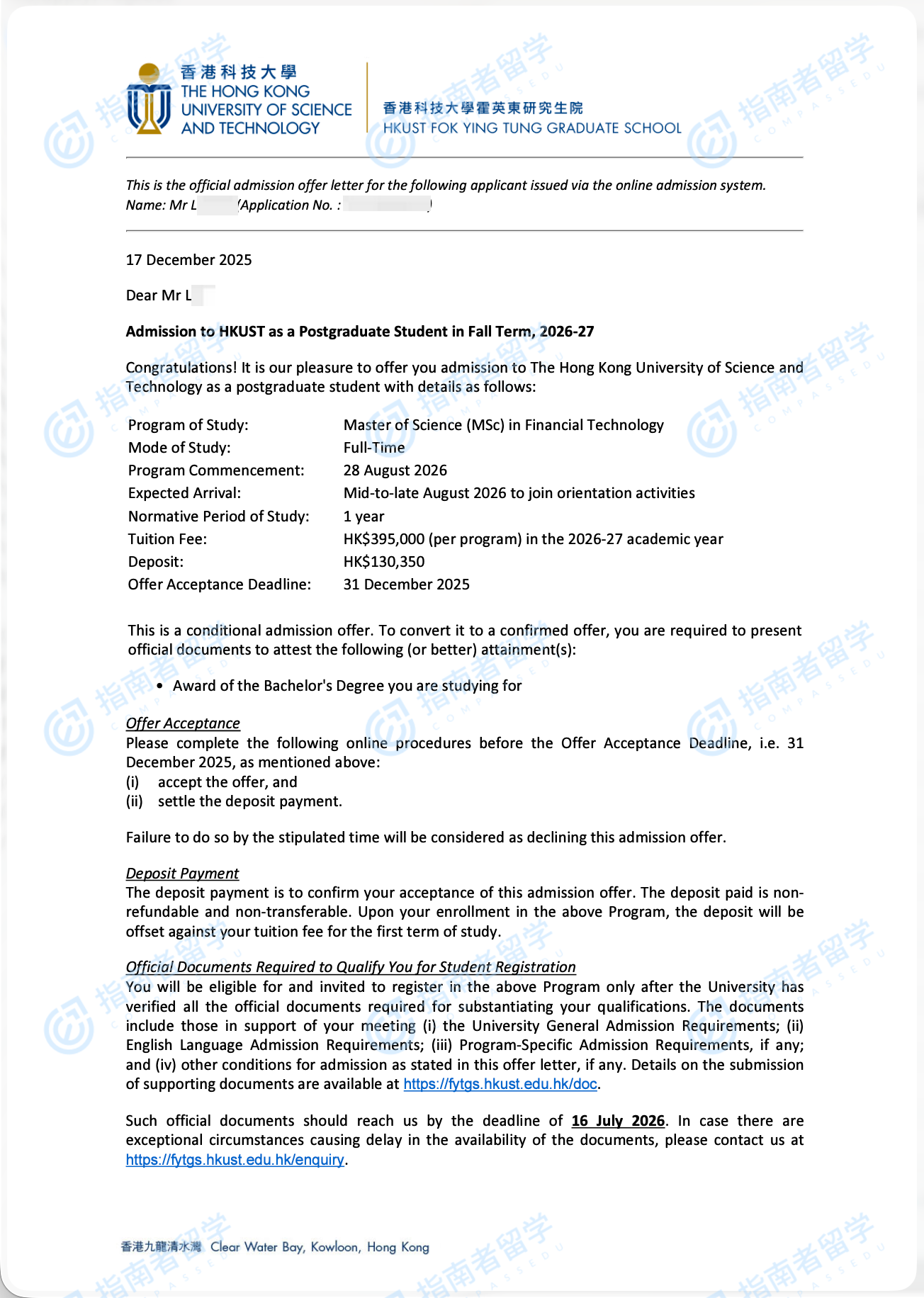 香港科技大學(xué)金融科技理學(xué)碩士研究生offer一枚